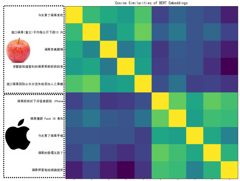 将不同的句子输入Bert,计算Bert输出的各embedding间的距离(欧几里得距离或余弦相似度),画出热力图。